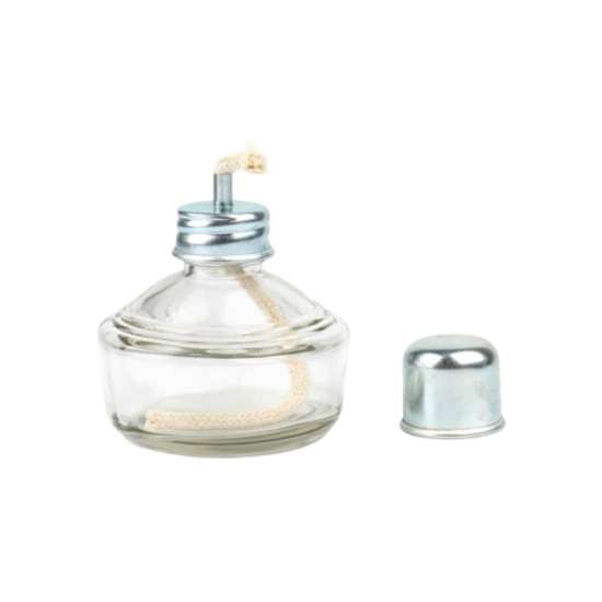 این چراغ شیشهای بوده و همانطور که از نام آن مشخص است با الکل روشن میشود. فیتیلهای که در قسمت بالایی مخزن شیشهای چراغ قرار گرفته، الکل را جذب میکند. این حالت برای جلوگیری از تبخیر الکل و جلوگیری از خاموش شدن چراغ ضروری است. همچنین این چراغ درپوشی دارد که با قرار دادن آن روی فیتیله میتوان آن را خاموش کرد و از تبخیر سوخت جلوگیری کرد.